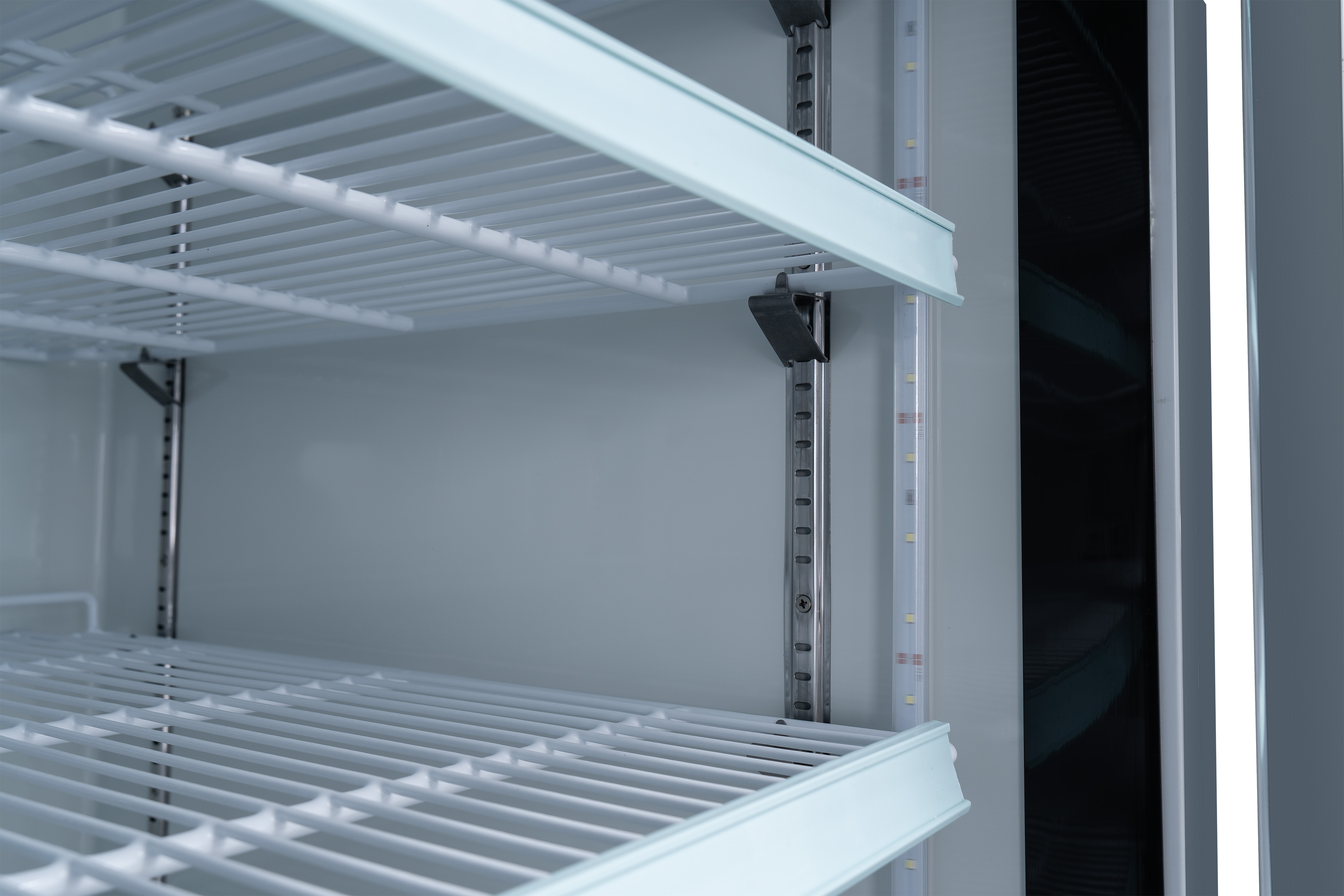The refrigerator’s glass doors enhance product visibility and draw customer attention, making it ideal for supermarkets, cafés, and delis. Combining ample storage with a stylish design, it elevates both the appearance and functionality of your business. The spacious cabinet features multiple adjustable shelves, allowing you to maximize storage and customize the layout to suit your needs. These shelves offer a high load capacity of up to 90 lbs each, providing ample space for storing a wide array of products.