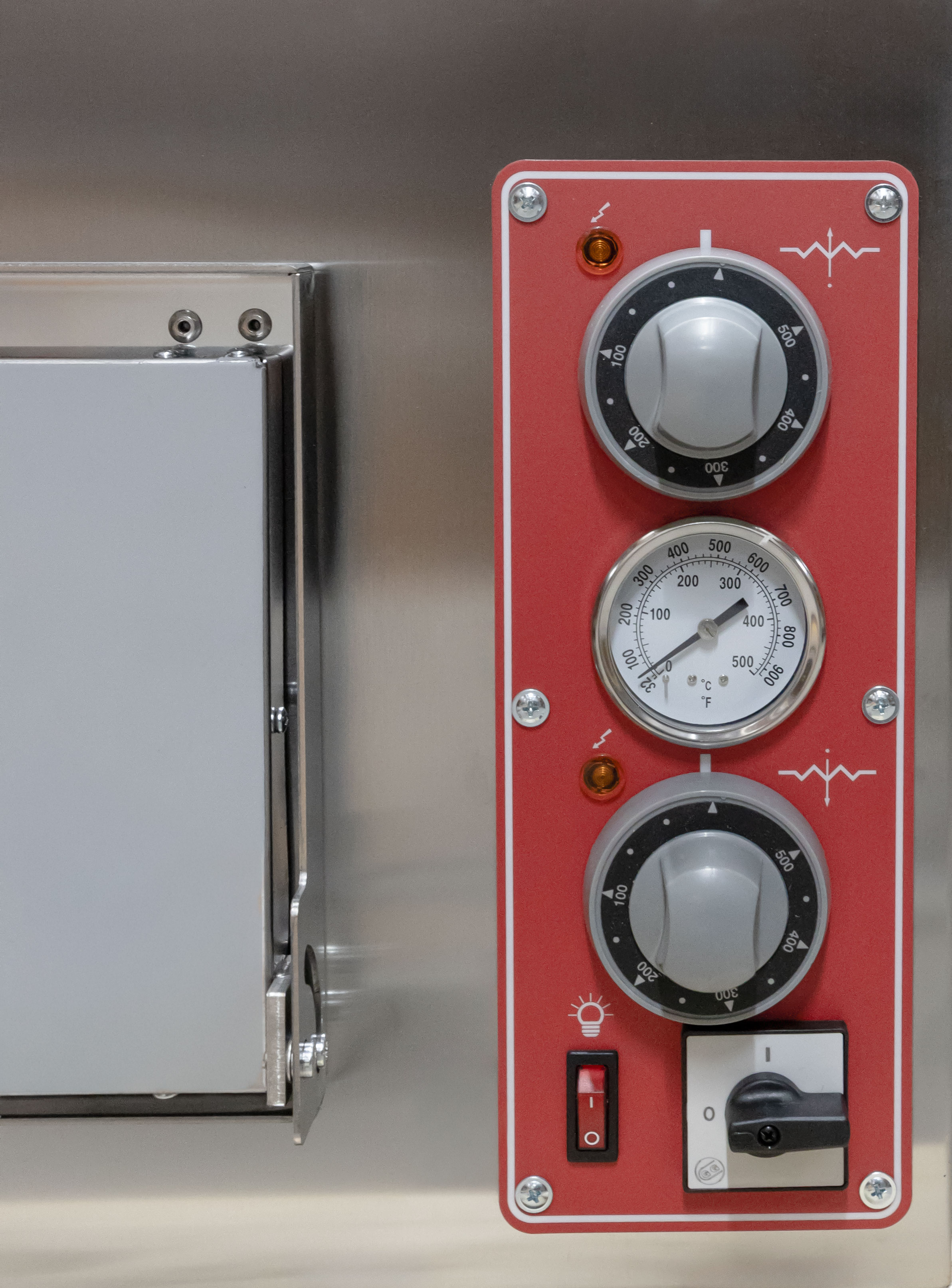 Stainless steel front, two mechanical thermostats per chamber, heat resistant, light, main switch for each chamber, stainless steel door with glass and handle (Each chamber is independent)