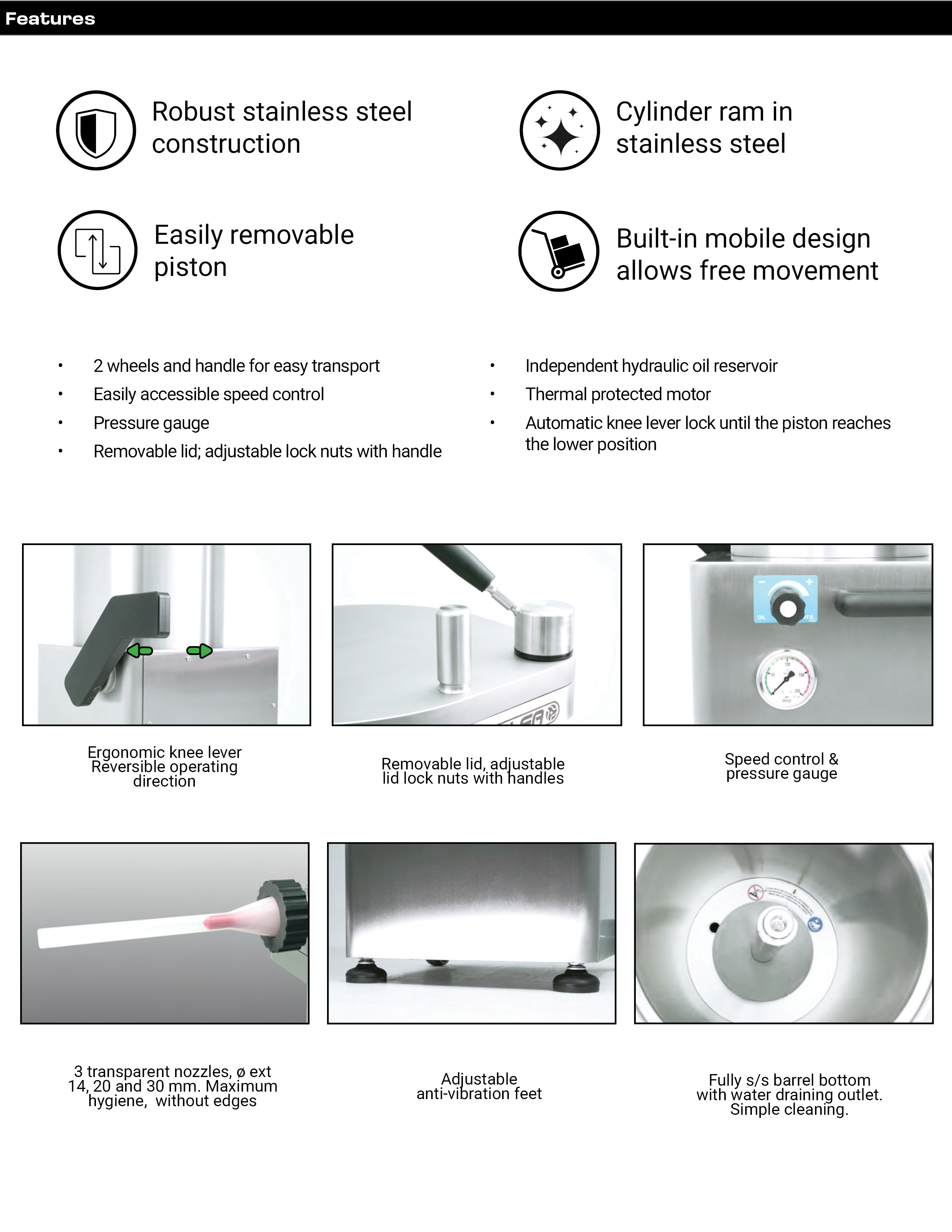 Experience the power of hydraulic technology that makes sausage stuffing smoother and more efficient than ever.The hydraulic piston ensures consistent pressure, making it easy to control the sausage stuffing process and achieve professional results every time. It’s built to withstand the demands in the kitchens. Upgrade your sausage-making game with this equipment.